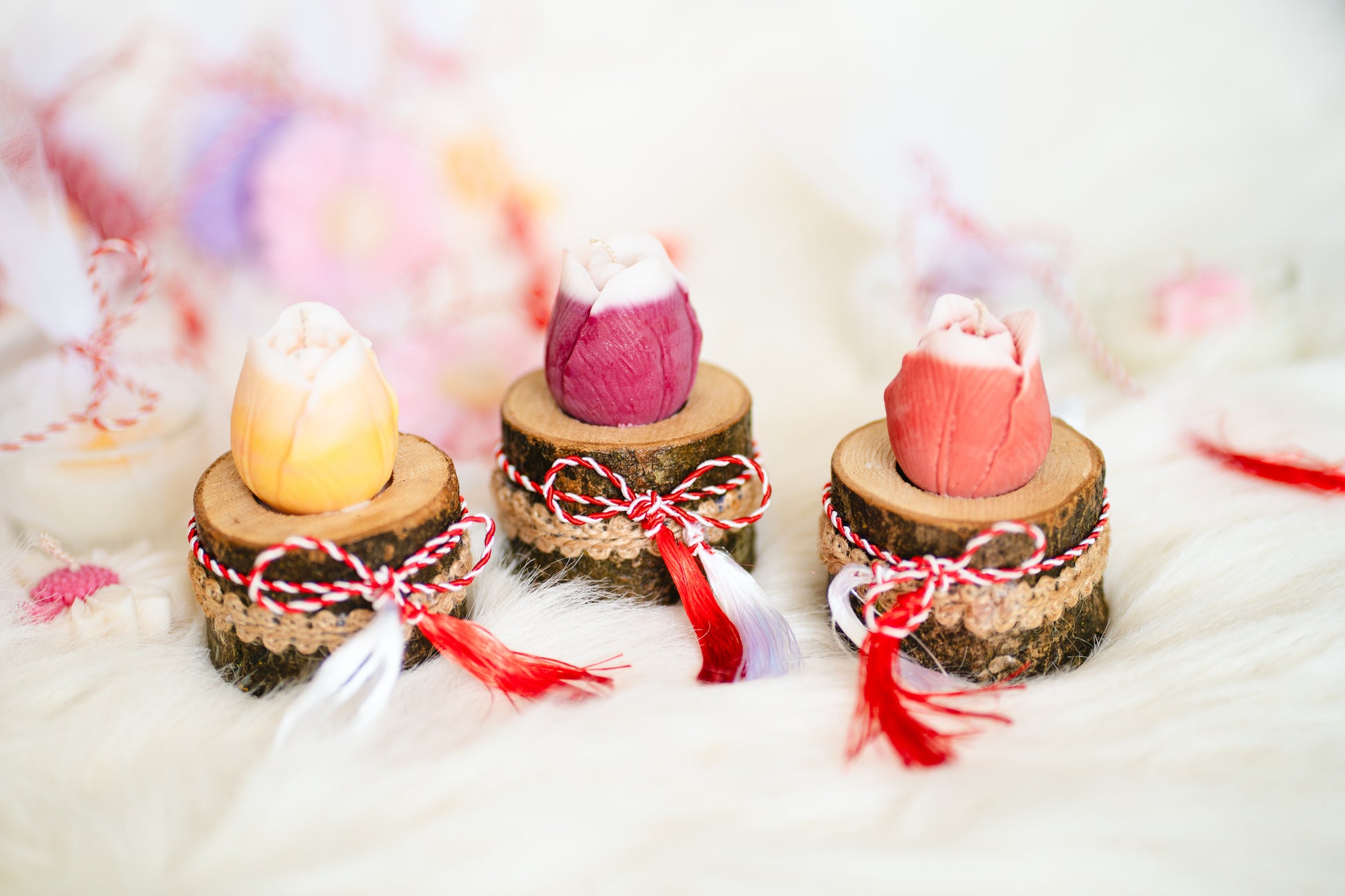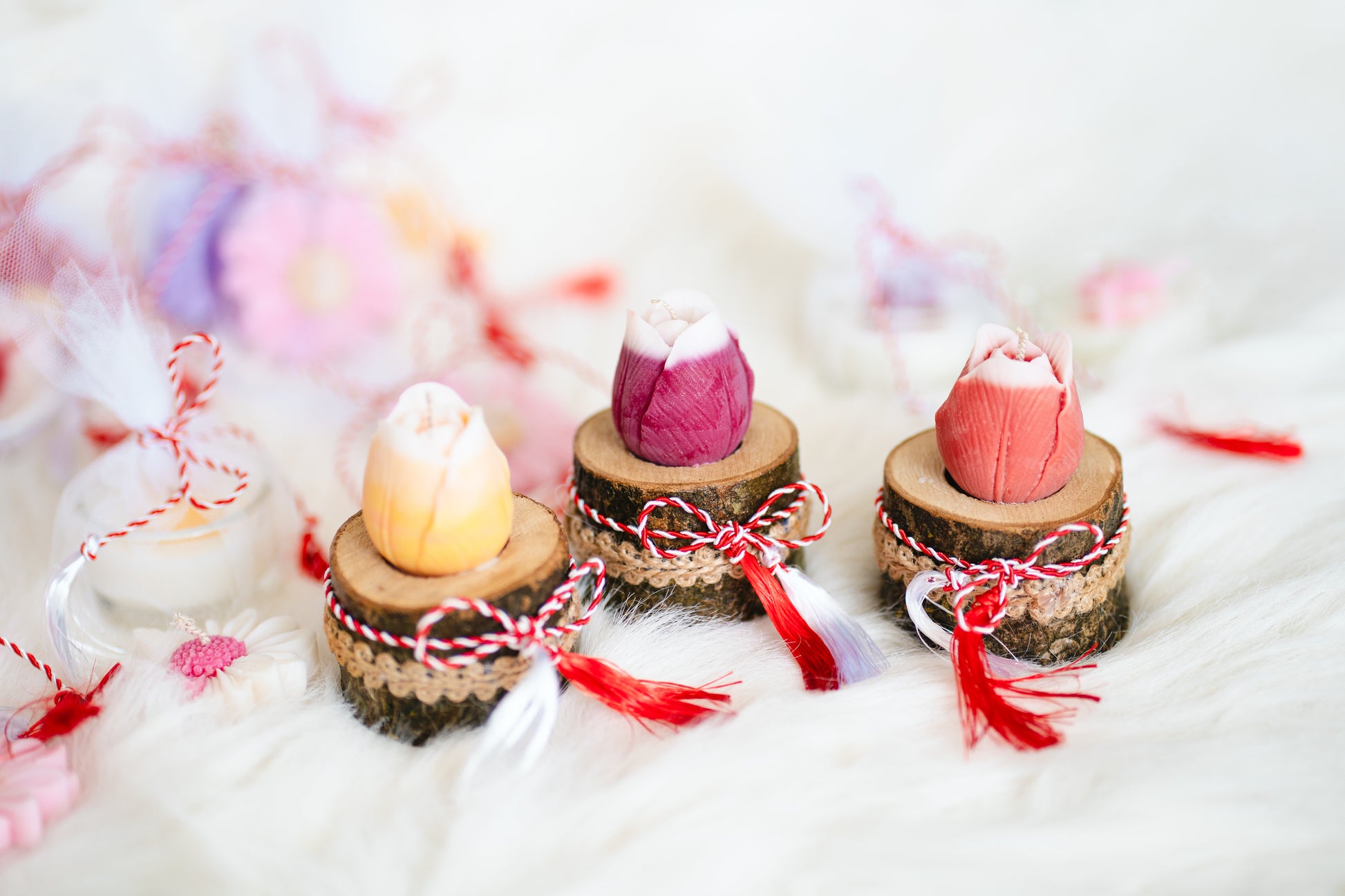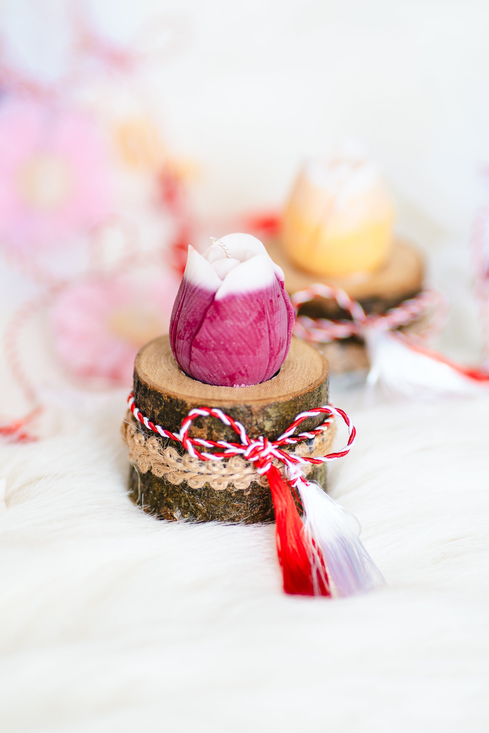 Oferă primăvara în dar cu un mărțișor cu adevărat special: o lumânare parfumată din ceară naturală de soia, turnată manual în formă de boboc de floare, așezată elegant pe un suport din lemn natural lucrat manual, completat de șnurul alb-roșu tradițional românesc.