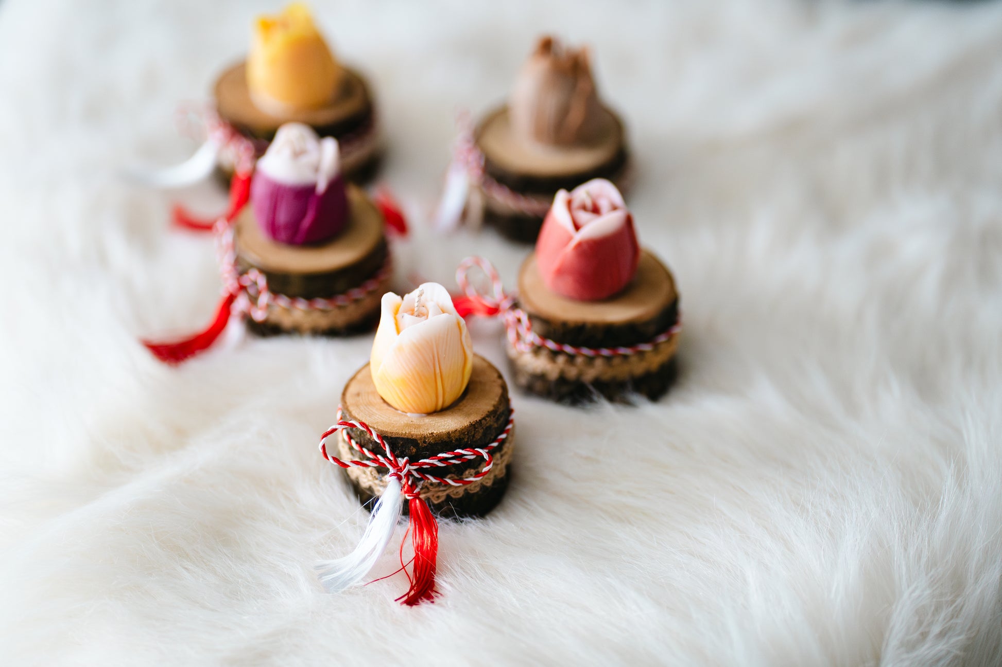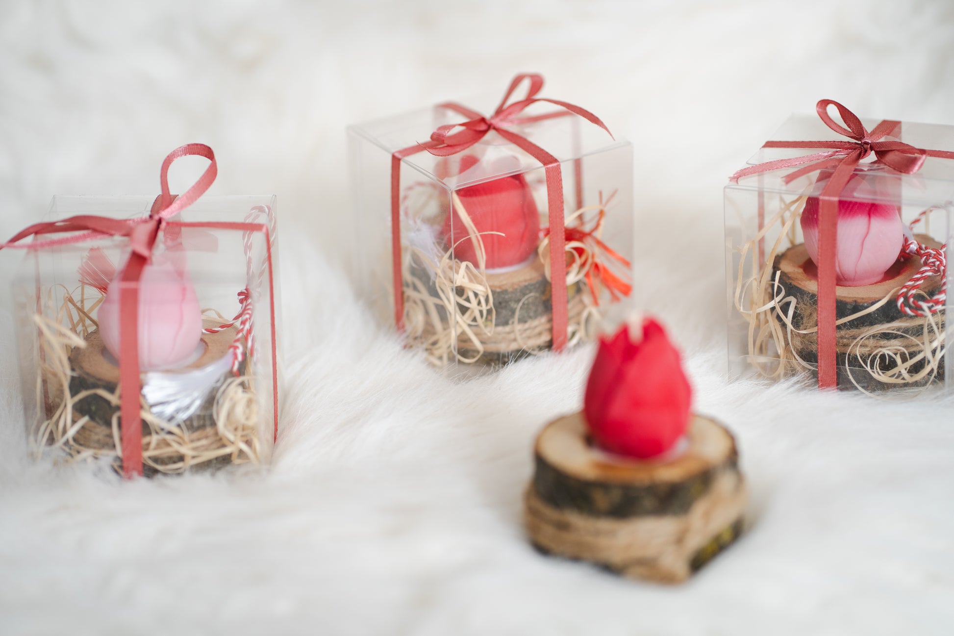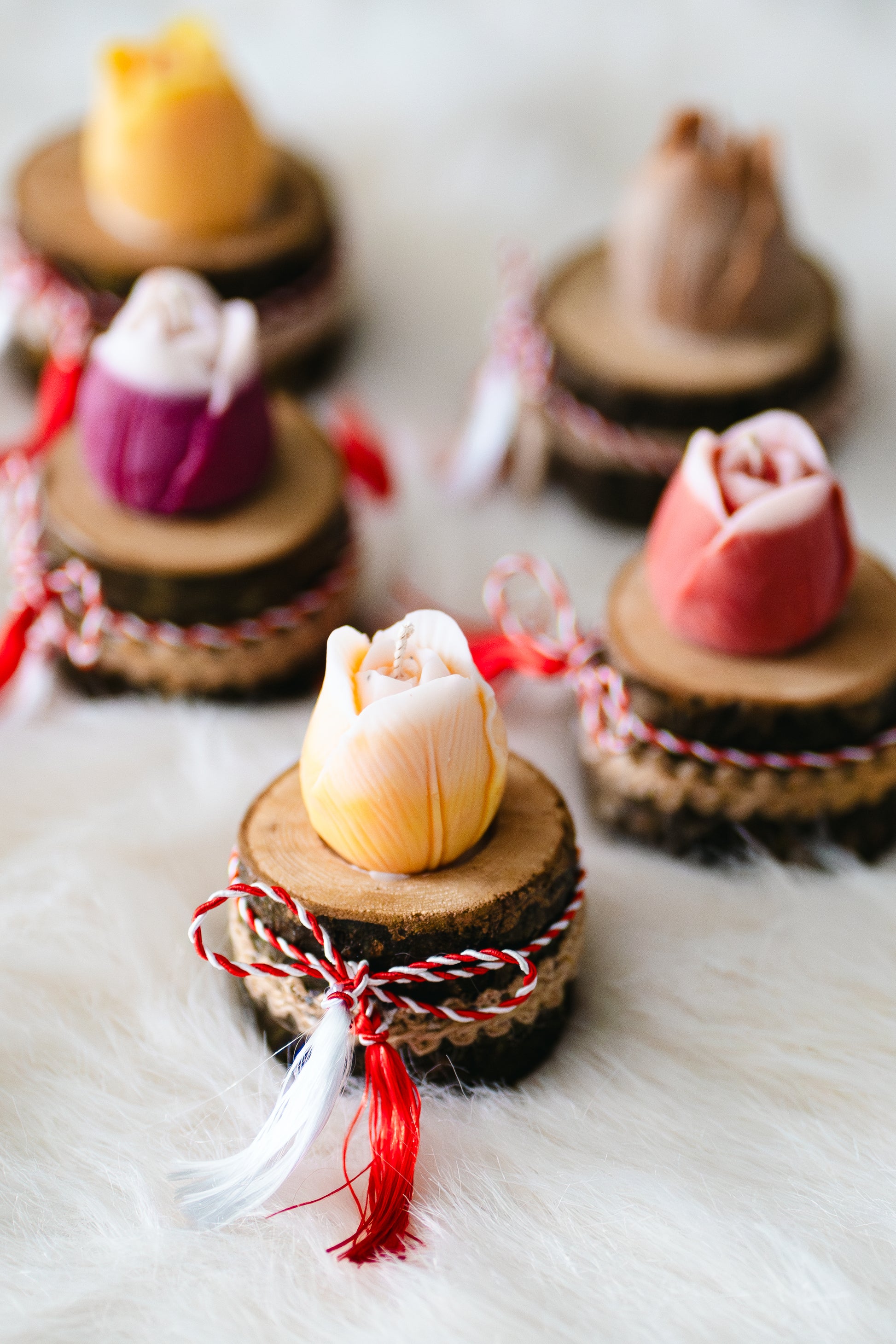 Oferă primăvara în dar cu un mărțișor cu adevărat special: o lumânare parfumată din ceară naturală de soia, turnată manual în formă de boboc de floare, așezată elegant pe un suport din lemn natural lucrat manual, completat de șnurul alb-roșu tradițional românesc.