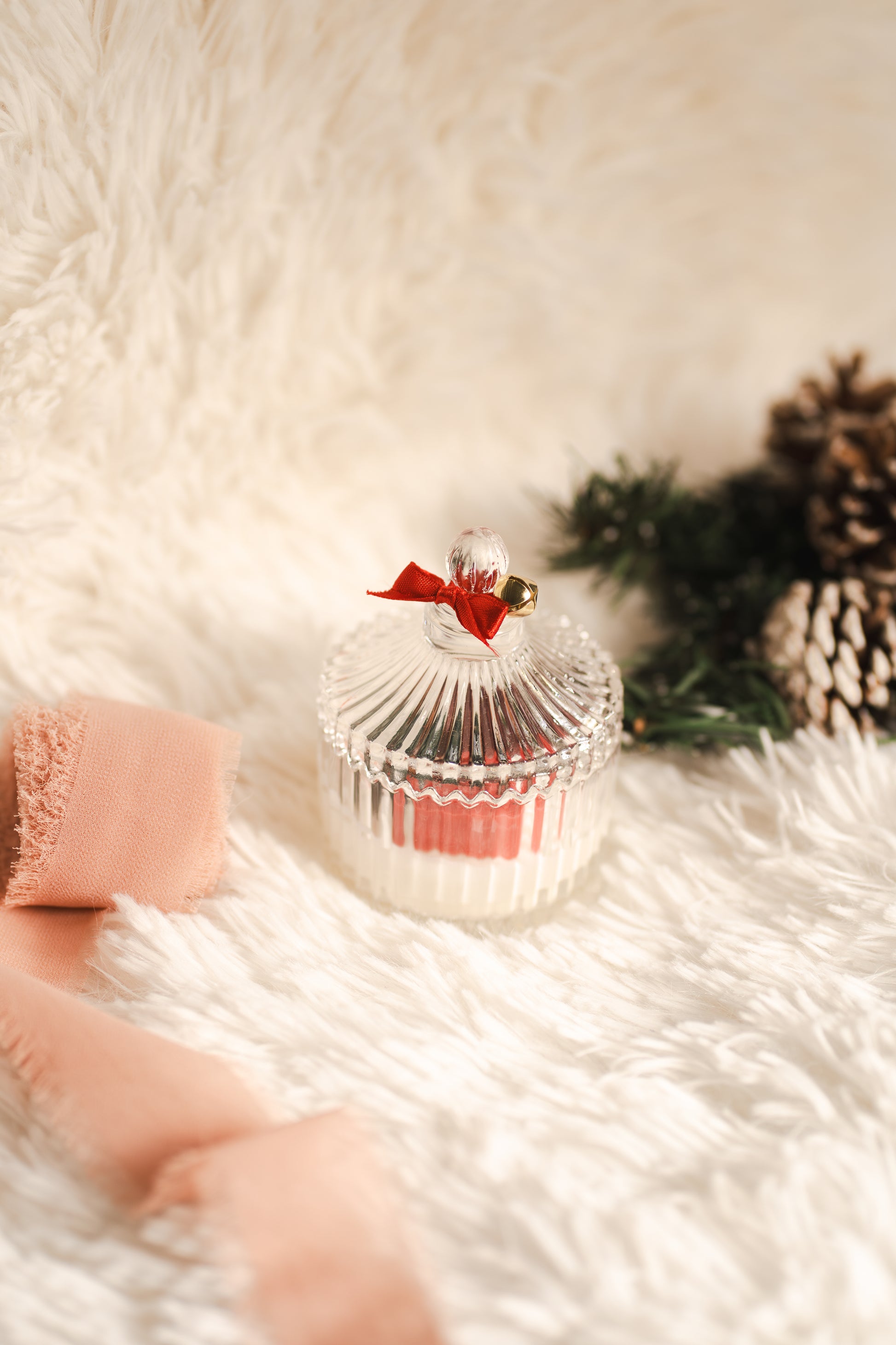 Adaugă un strop de magie sărbătorilor cu această lumânare parfumată handmade, turnată manual din ceară naturală de soia, într-o elegantă bombonieră de sticlă cu capac, decorată cu o fundă roz și clopoțel auriu. În interior, lumânarea este accesorizată cu figurine adorabile din ceară în formă de brăduț, bastonaș de Crăciun și cadou – fiecare turnată manual, cu grijă la detalii.