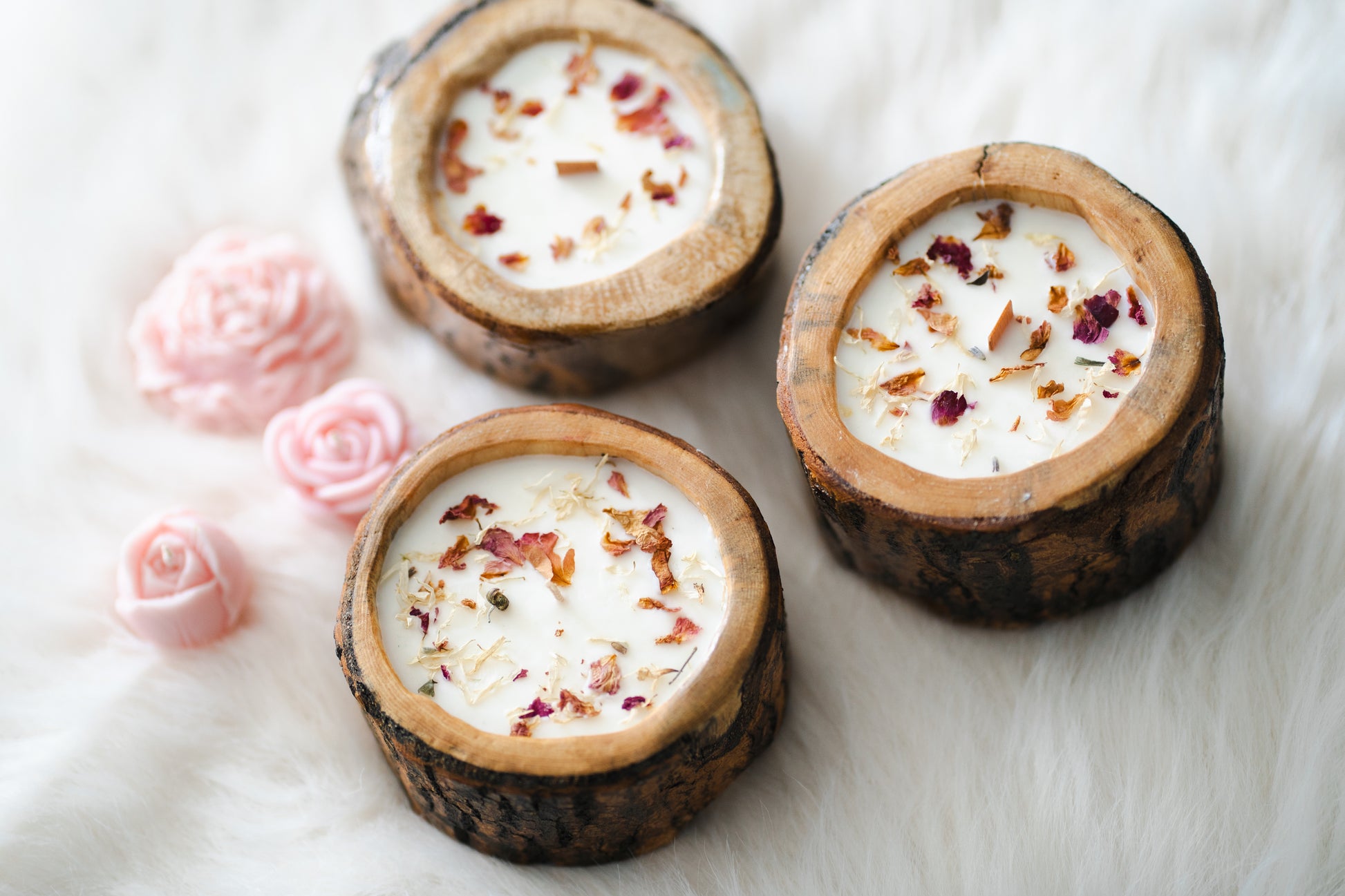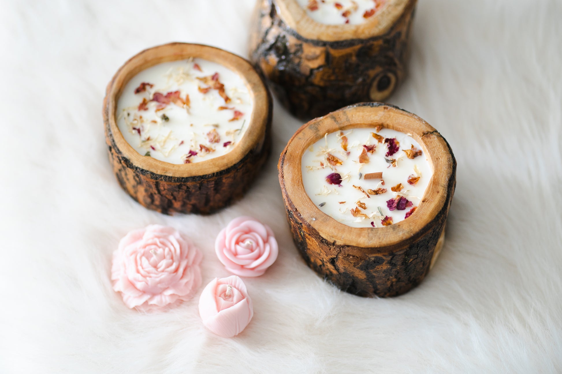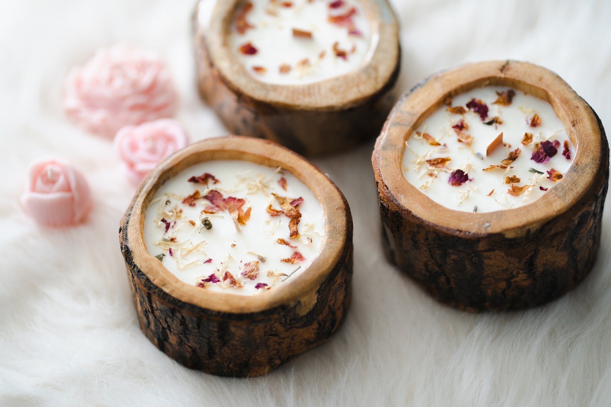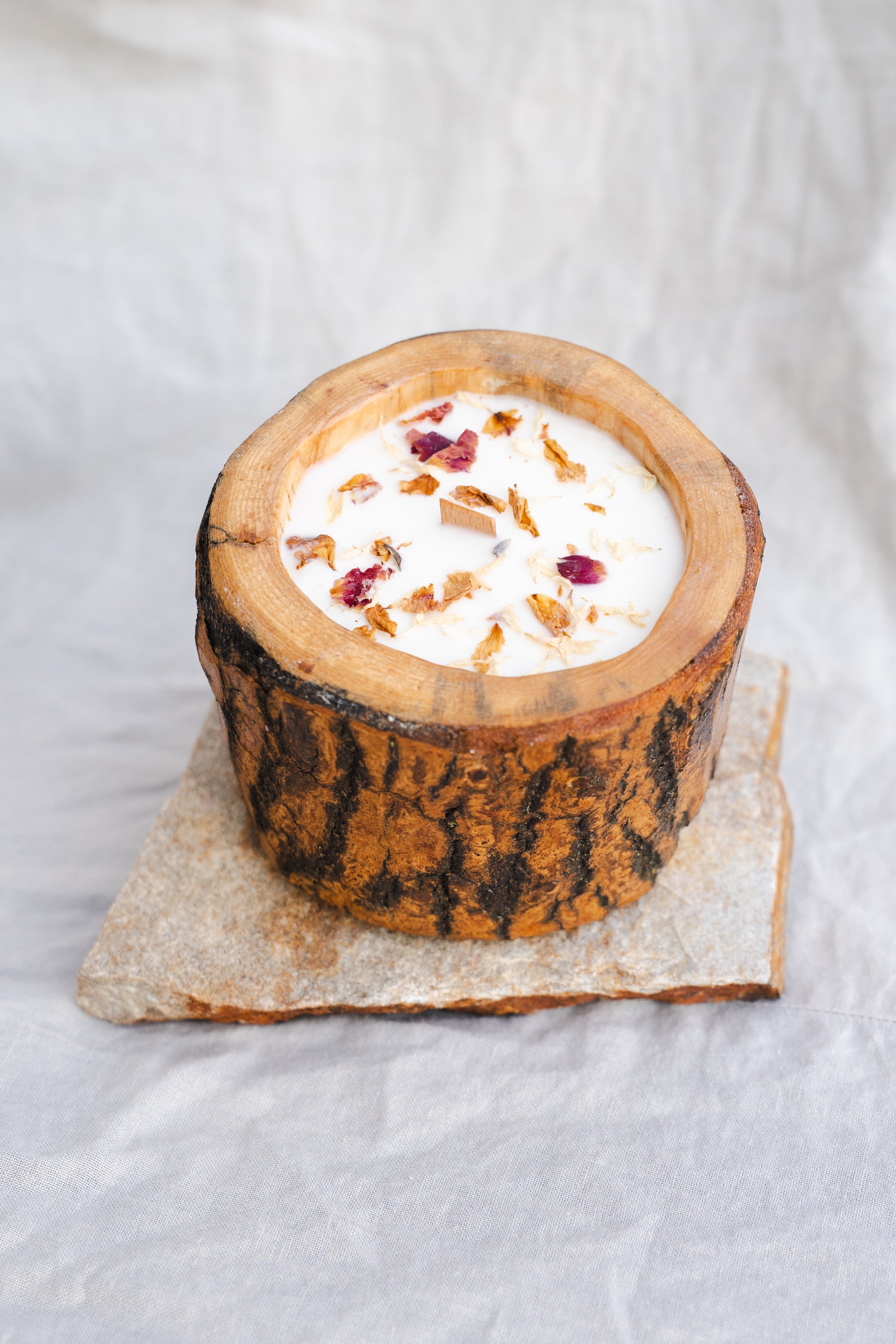 Lumânare parfumată din ceară de soia – în recipient din lemn cu scoarță, decorată cu flori uscate