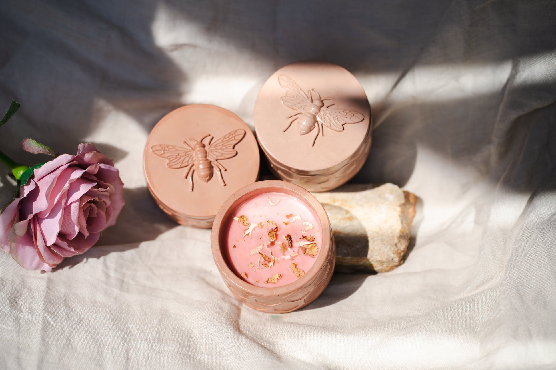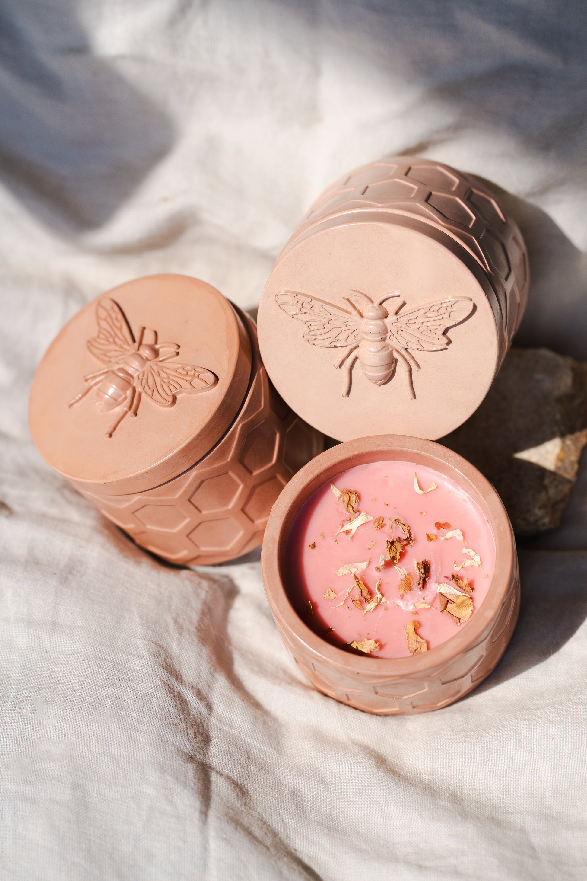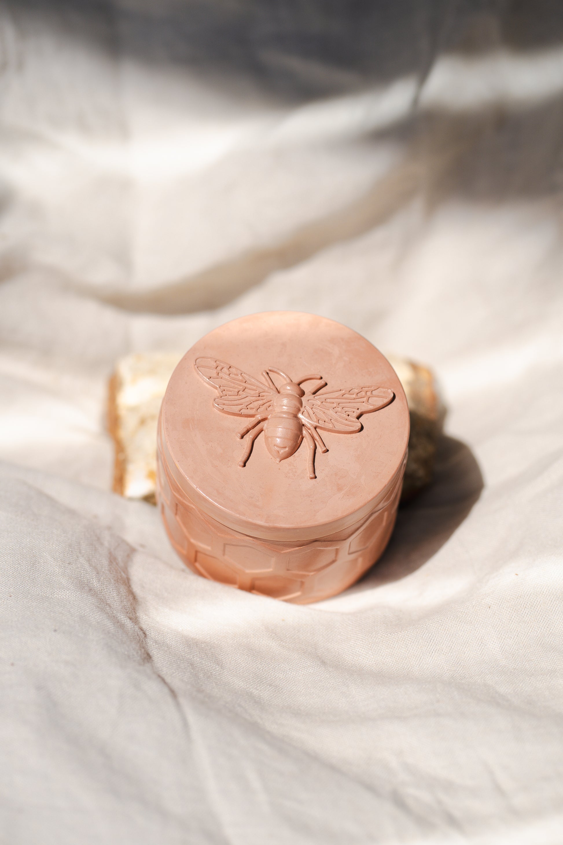 Recipientul ceramic cu textură hexagonală inspirată din fagure și capacul embosat cu imaginea unei albine creează o estetică rustică, dar sofisticată, potrivită atât pentru interioare moderne, cât și pentru decoruri naturale, boho sau organice. În interior, lumânarea parfumată îmbină arome florale și note botanice, presărată cu petale uscate pentru un plus de autenticitate vizuală și olfactivă.