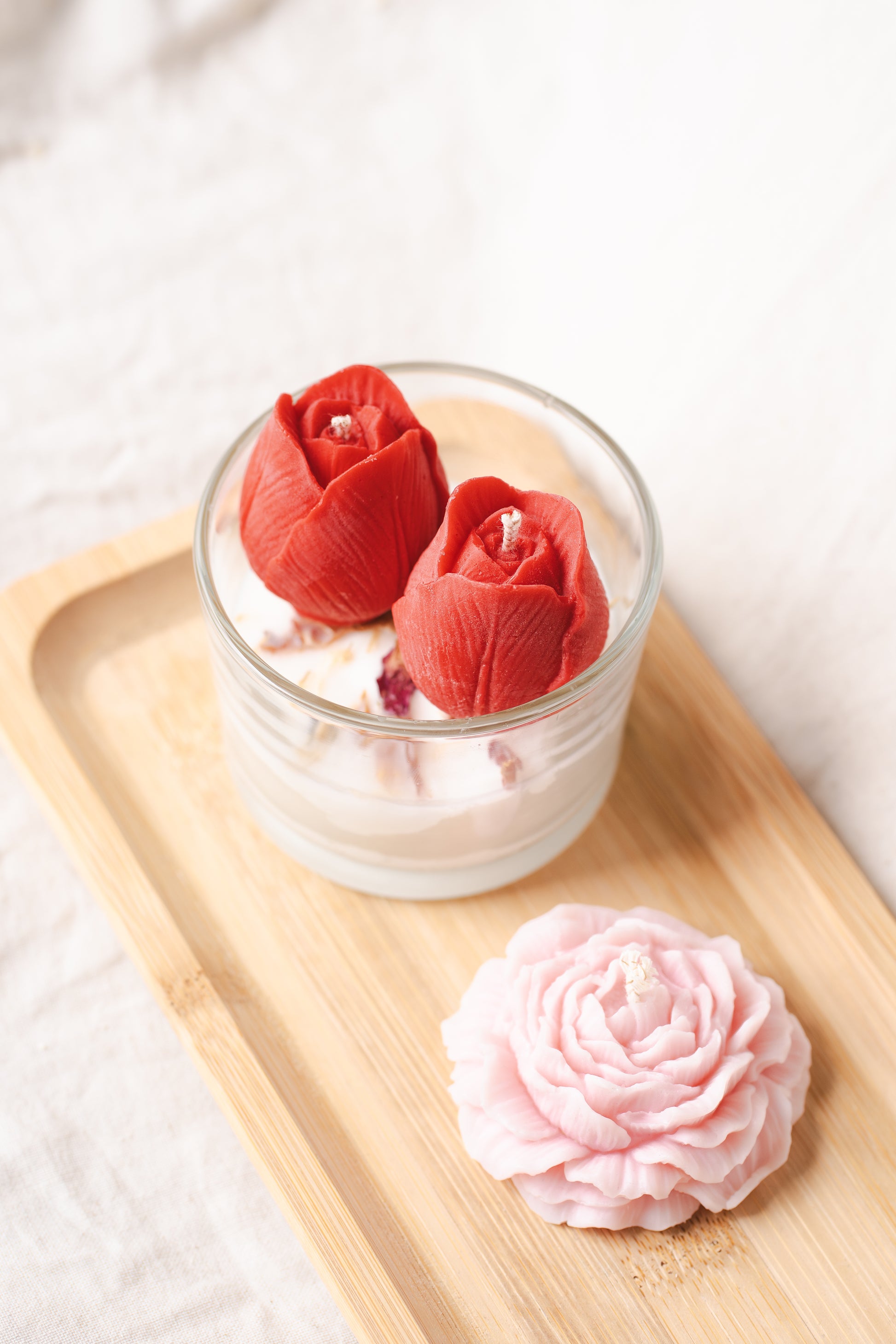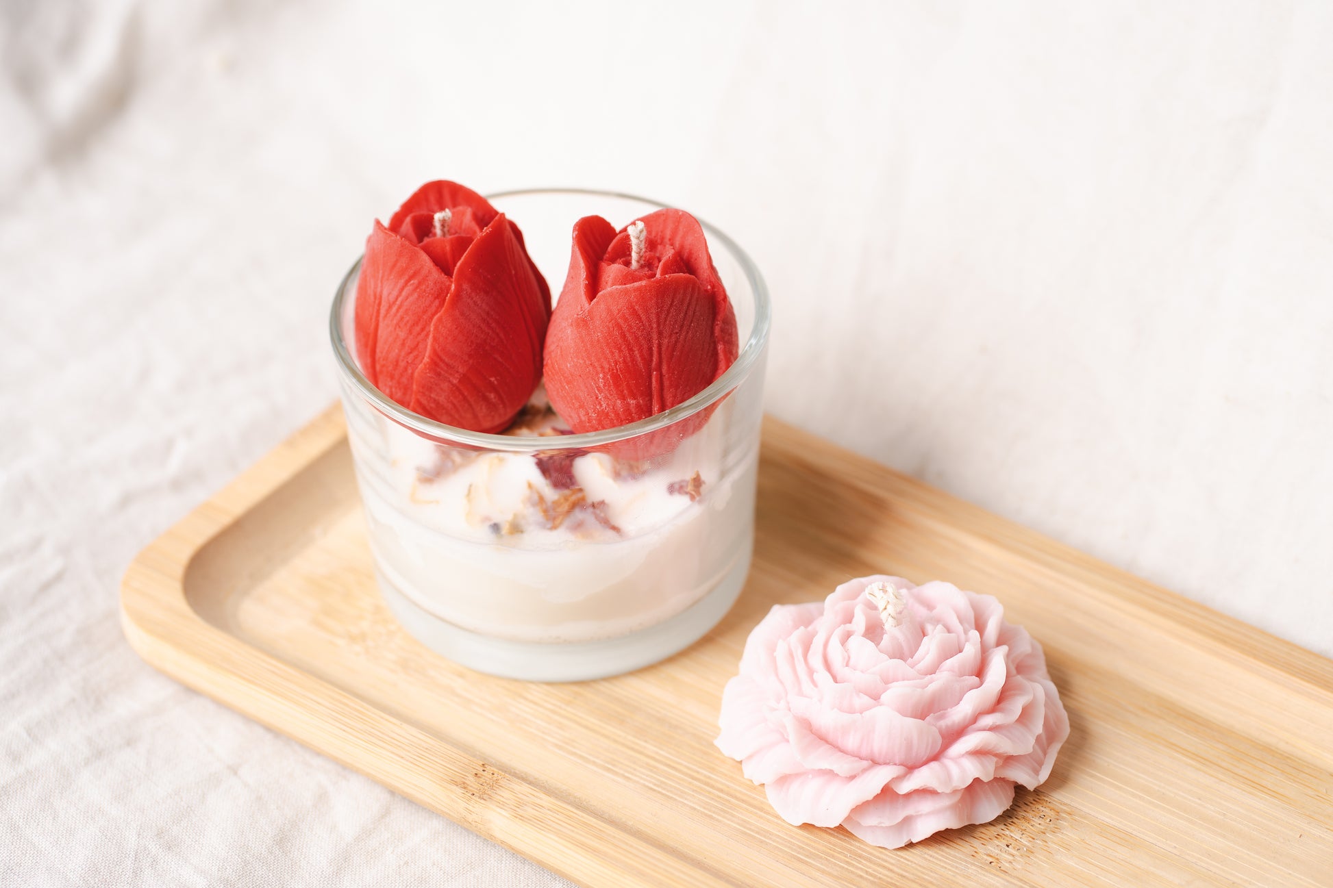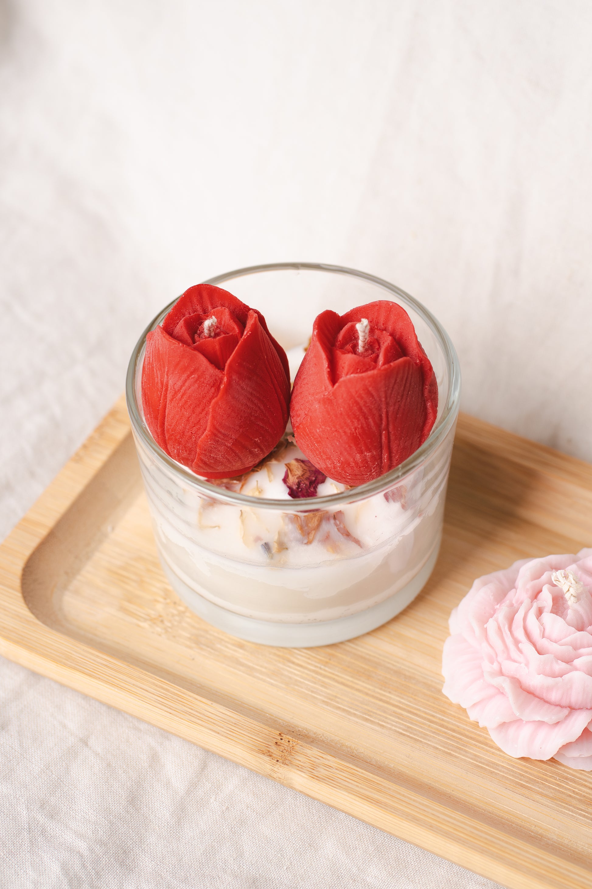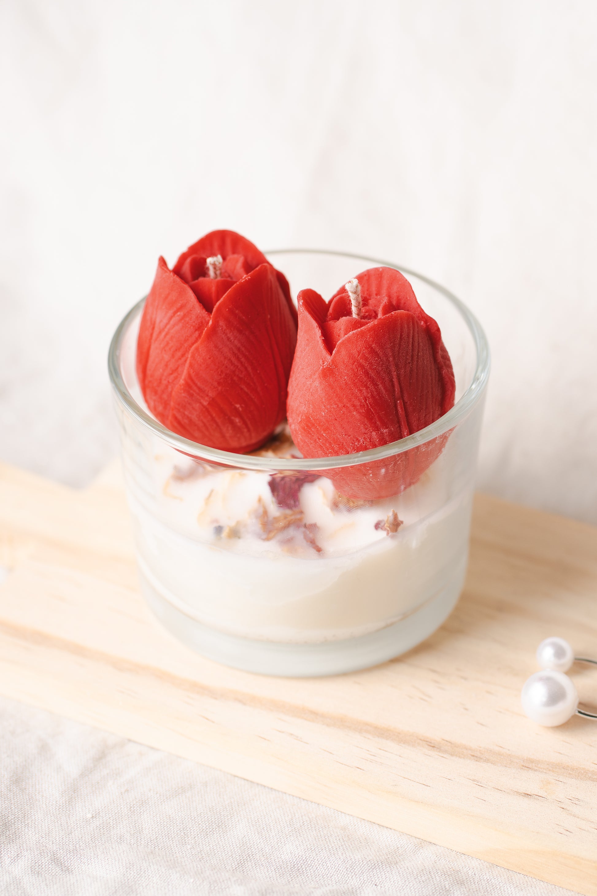 Alege un cadou floral și rafinat cu această lumânare parfumată handmade, turnată din ceară naturală de soia, într-un pahar de sticlă elegant, decorat cu lalele roșii și flori uscate naturale. Un adevărat accent decorativ care aduce primăvara în orice colț al casei.