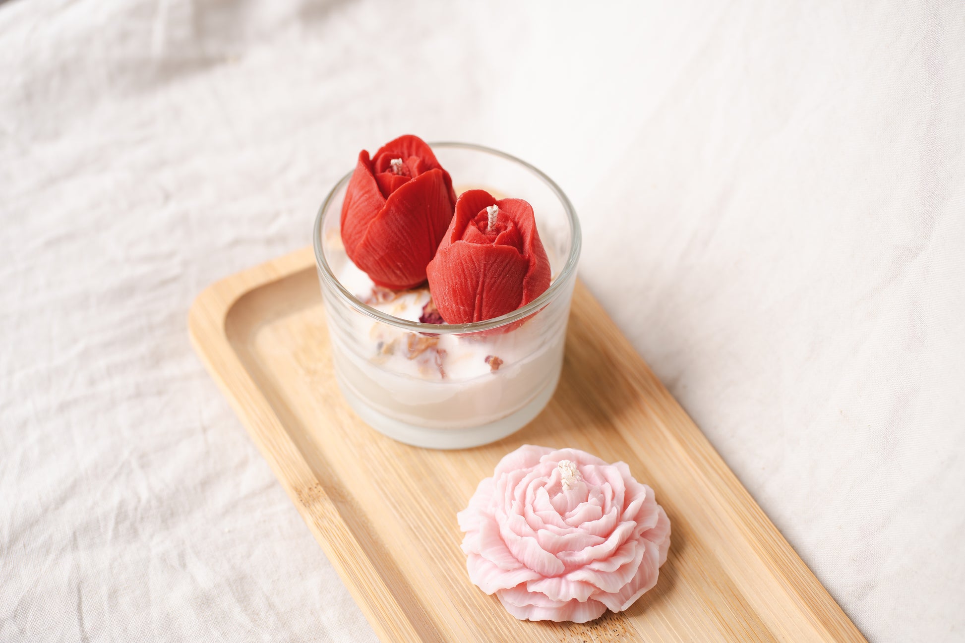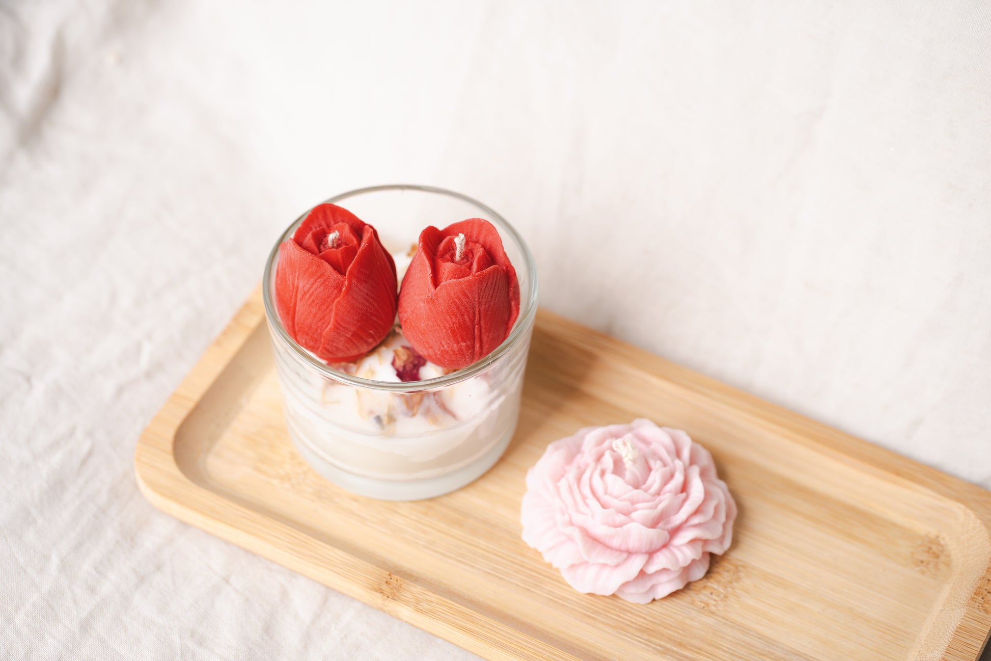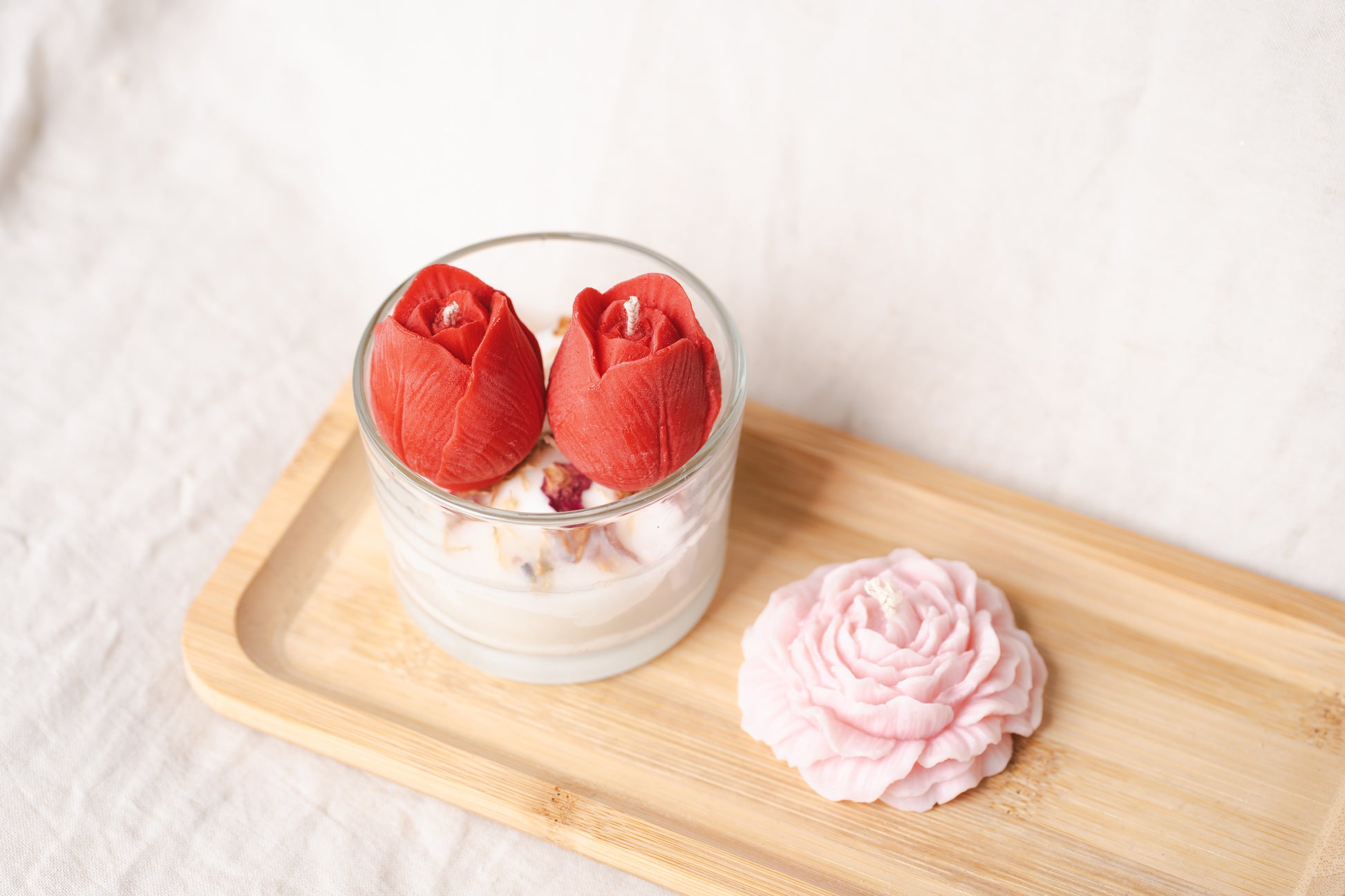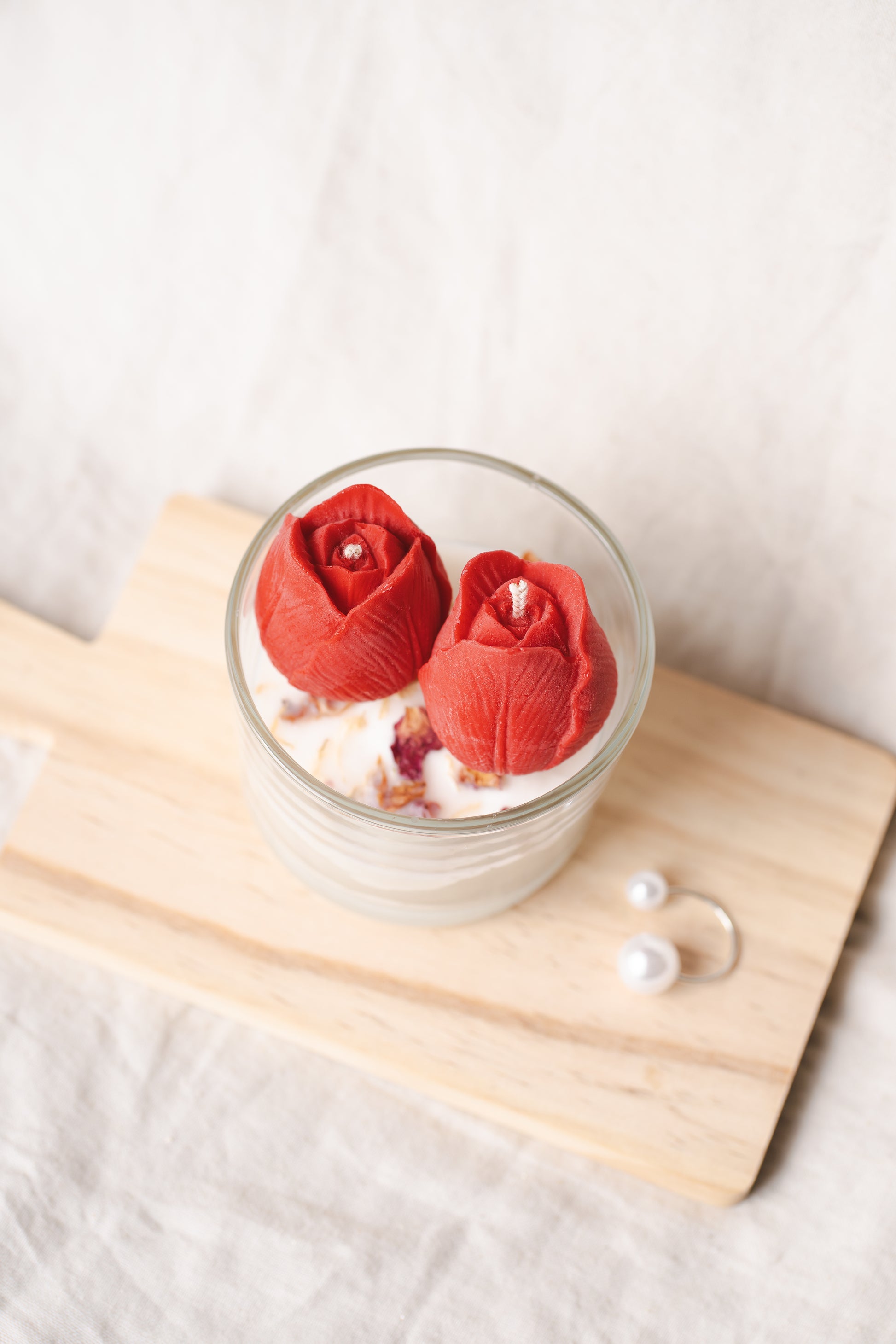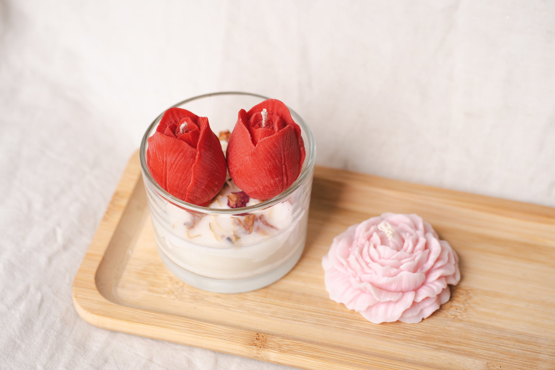 Alege un cadou floral și rafinat cu această lumânare parfumată handmade, turnată din ceară naturală de soia, într-un pahar de sticlă elegant, decorat cu lalele roșii și flori uscate naturale. Un adevărat accent decorativ care aduce primăvara în orice colț al casei.