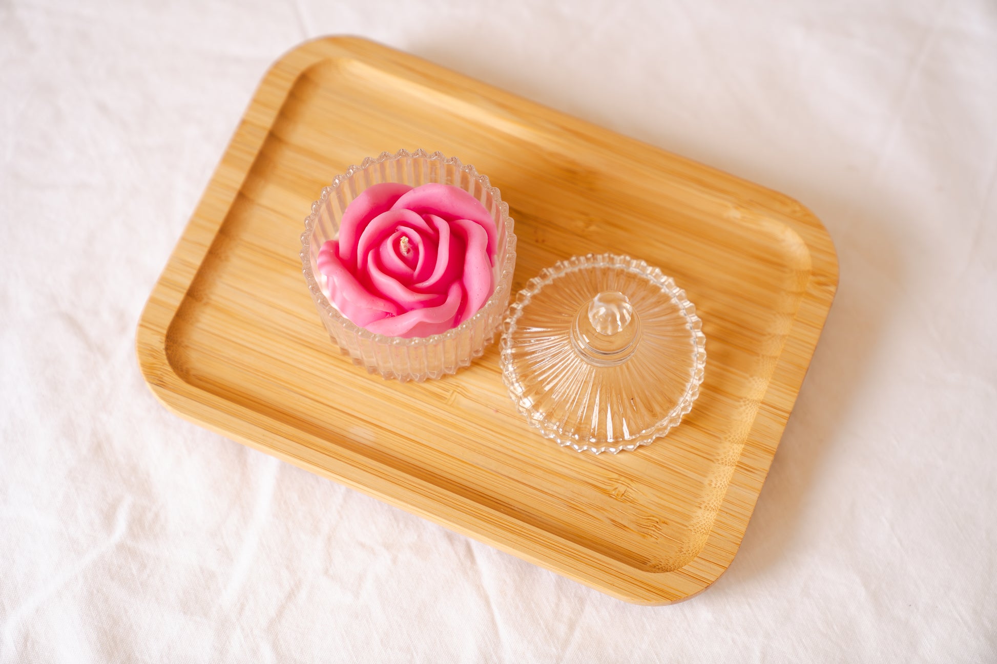 Lumânare parfumată trandafir din ceară de soia – recipient bombonieră din sticlă