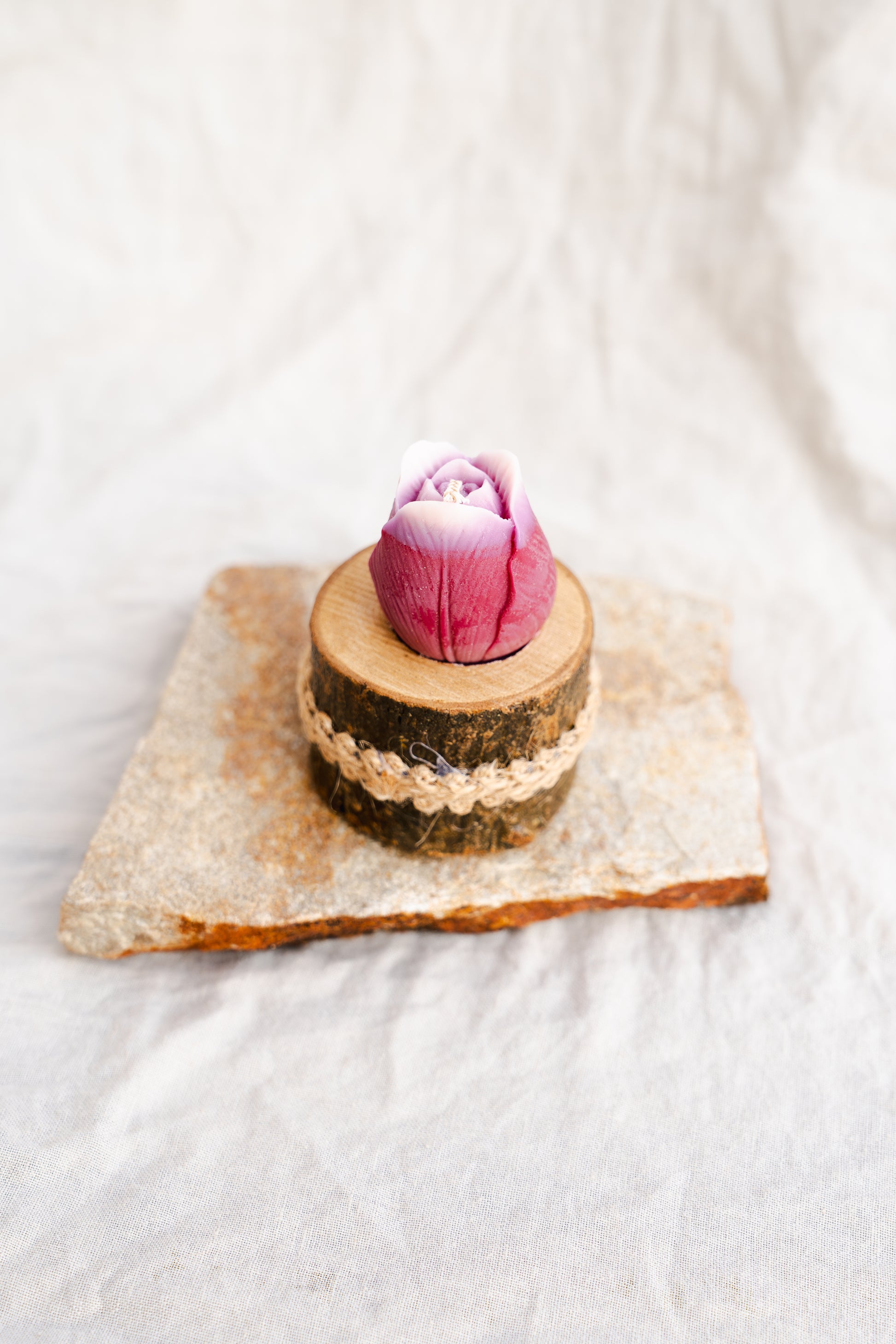Surprinde-ți invitații cu o mărturie de botez inedită și naturală, realizată cu grijă și rafinament: o lumânare parfumată handmade din ceară naturală de soia, turnată în formă de floare și așezată într-un recipient rustic din lemn cu scoarță naturală. O alegere elegantă și eco-friendly, perfectă pentru evenimente cu tematică naturală, rustică sau boho.