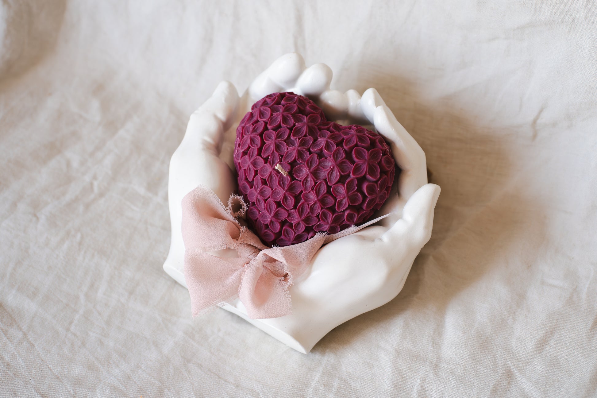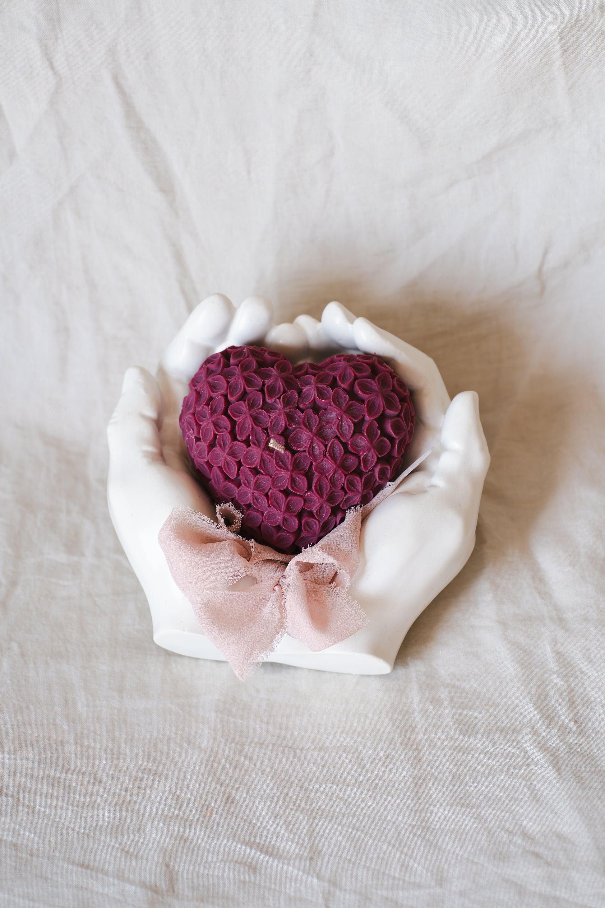 Set cadou handmade – suport ceramic în formă de mâini și lumânare parfumată în formă de inimă