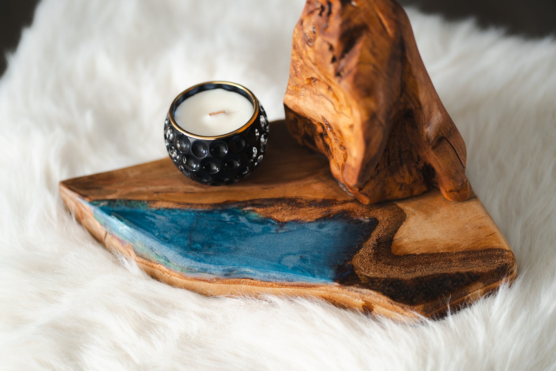 - Suport decorativ din lemn natural și rășină epoxidică albastră, cu efect lucios, modern și sofisticat