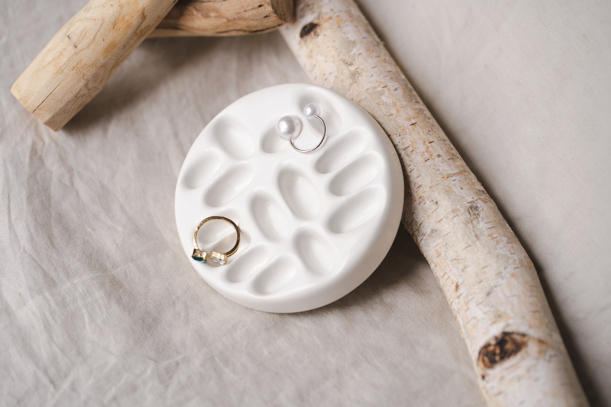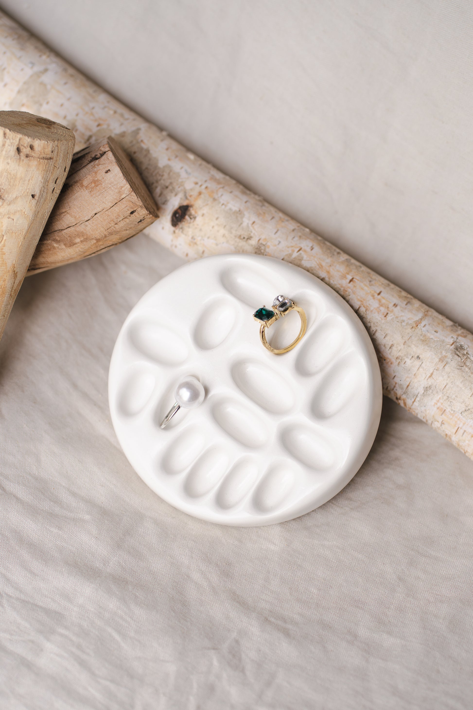 Păstrează-ți bijuteriile în siguranță și cu stil cu acest suport organizator handmade din praf ceramic, în nuanță albă mată, cu un design minimalist și elegant. Turnat manual, cu atenție la detalii, este ideal pentru depozitarea inelor, cerceilor, colierelor sau a altor accesorii mici.