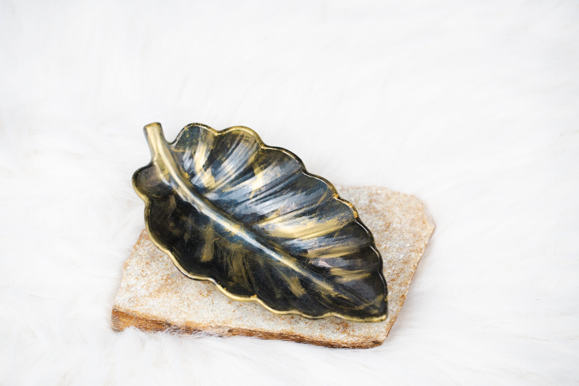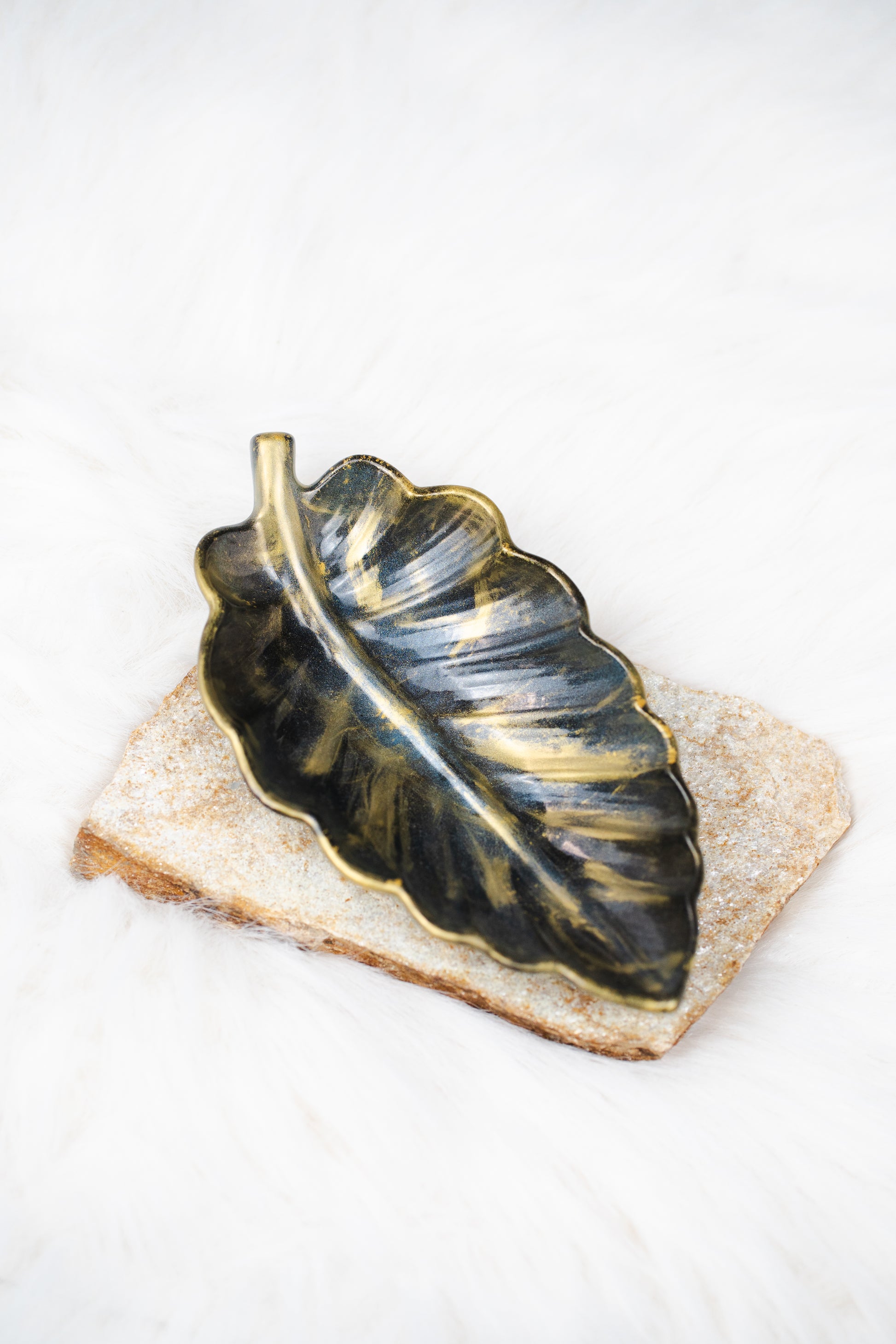 Tavă decorativă din rășină epoxidică – formă de frunză, negru cu auriu